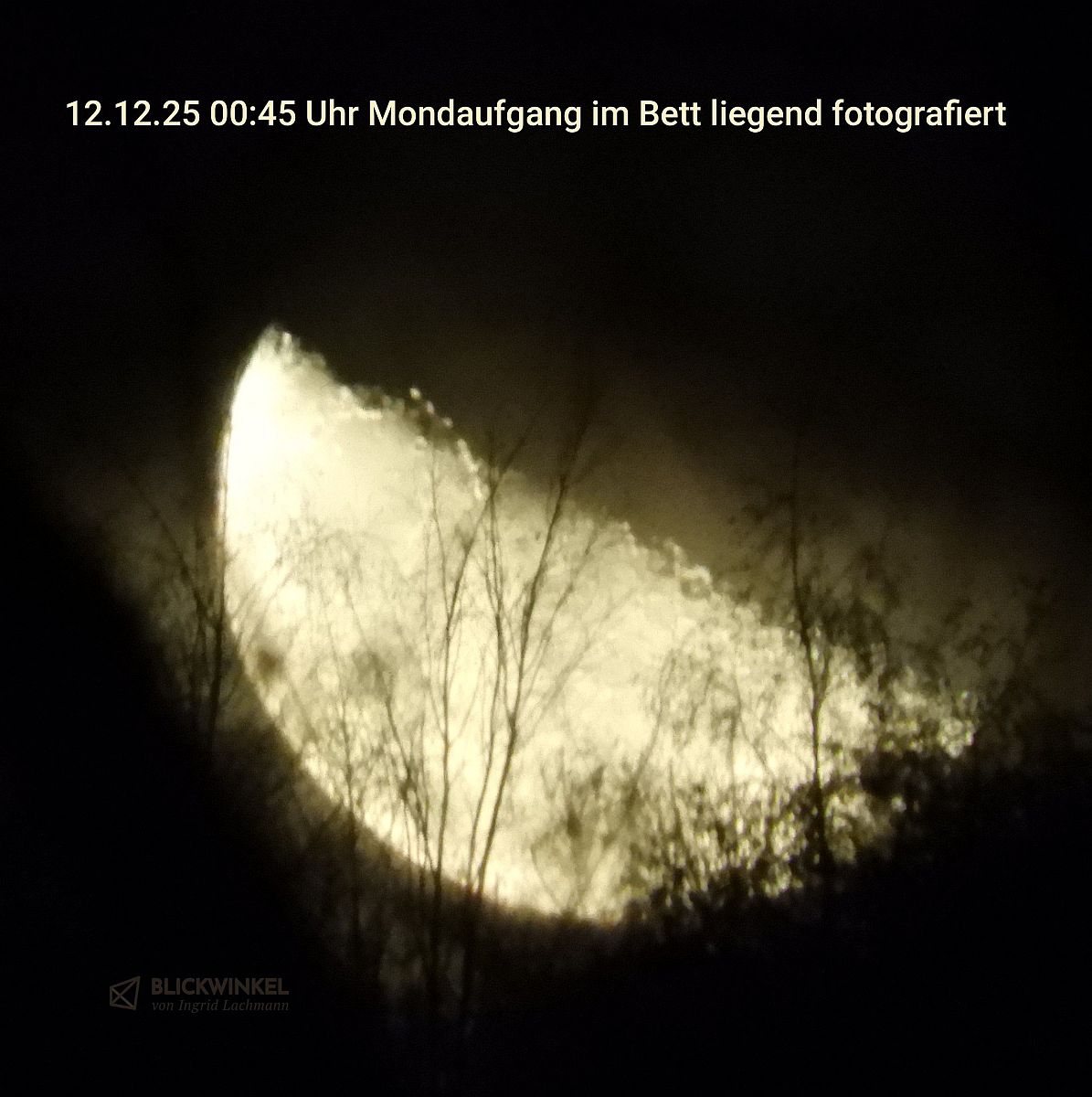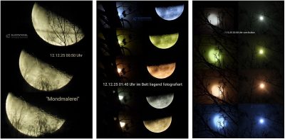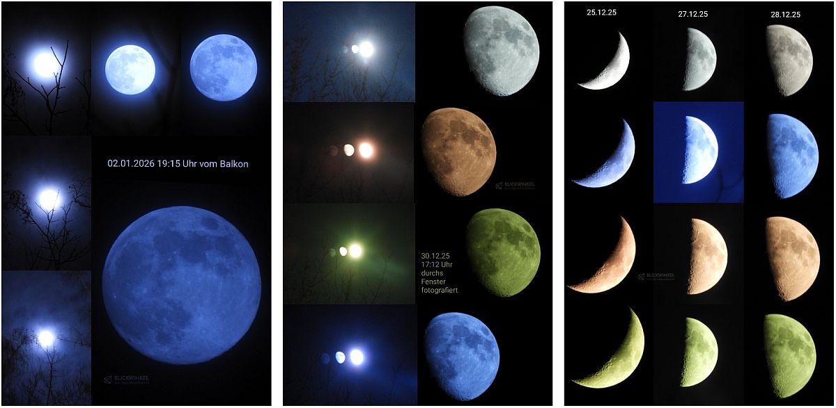 Die unterschiedlichen Farben der Mondbilder entstehen durch die Kompaktkamera selbst (Mond- oder Nachtaufnahme Modus und Farbfilter), den Stand des Mondes am Himmel, die Uhrzeit der Aufnahme und die Atmosphäre um den Mond. Außer Vergrößern oder Ausschneiden bearbeite ich meine Fotos nicht und ich bin immer wieder fasziniert von diesen, mir von meiner Kamera geschenkten, Aufnahmen. Alle Bilder habe ich ohne Stativ geknipst. Danke an meine Hände, meine Augen und den Stabilisator in der Kamera. Fast alle Fotos habe ich über den Südausgang des B93 Tunnels in Zwickau hinter unserem Hochhaus, vom Balkon oder durch mein Schlafzimmerfenster fotografiert.