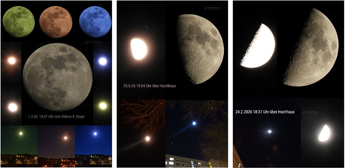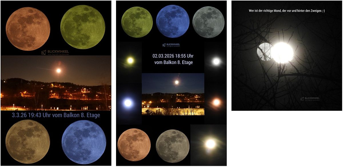 Die unterschiedlichen Farben der Mondbilder entstehen durch die Kompaktkamera selbst (Mond- oder Nachtaufnahme Modus und Farbfilter), den Stand des Mondes am Himmel, die Uhrzeit der Aufnahme und die Atmosphäre um den Mond. Außer Vergrößern oder Ausschneiden bearbeite ich meine Fotos nicht und ich bin immer wieder fasziniert von diesen, mir von meiner Kamera geschenkten, Aufnahmen. Alle Bilder habe ich ohne Stativ geknipst. Danke an meine Hände, meine Augen und den Stabilisator in der Kamera. Fast alle Fotos habe ich über den Südausgang des B93 Tunnels in Zwickau hinter unserem Hochhaus, vom Balkon oder durch mein Schlafzimmerfenster fotografiert.