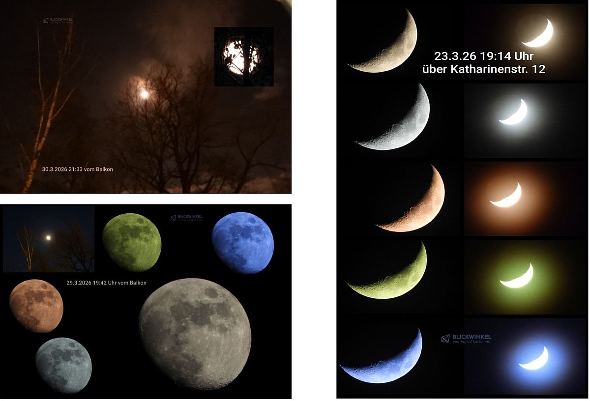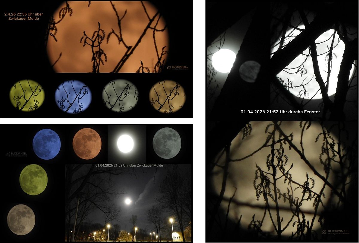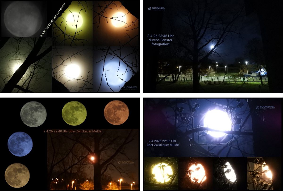 Die unterschiedlichen Farben der Mondbilder entstehen durch die Kompaktkamera selbst (Mond- oder Nachtaufnahme Modus und Farbfilter), den Stand des Mondes am Himmel, die Uhrzeit der Aufnahme und die Atmosphäre um den Mond. Außer Vergrößern oder Ausschneiden bearbeite ich meine Fotos nicht und ich bin immer wieder fasziniert von diesen, mir von meiner Kamera geschenkten, Aufnahmen. Alle Bilder habe ich ohne Stativ geknipst. Danke an meine Hände, meine Augen und den Stabilisator in der Kamera. Fast alle Fotos habe ich über den Südausgang des B93 Tunnels in Zwickau hinter unserem Hochhaus, vom Balkon oder durch mein Schlafzimmerfenster fotografiert.